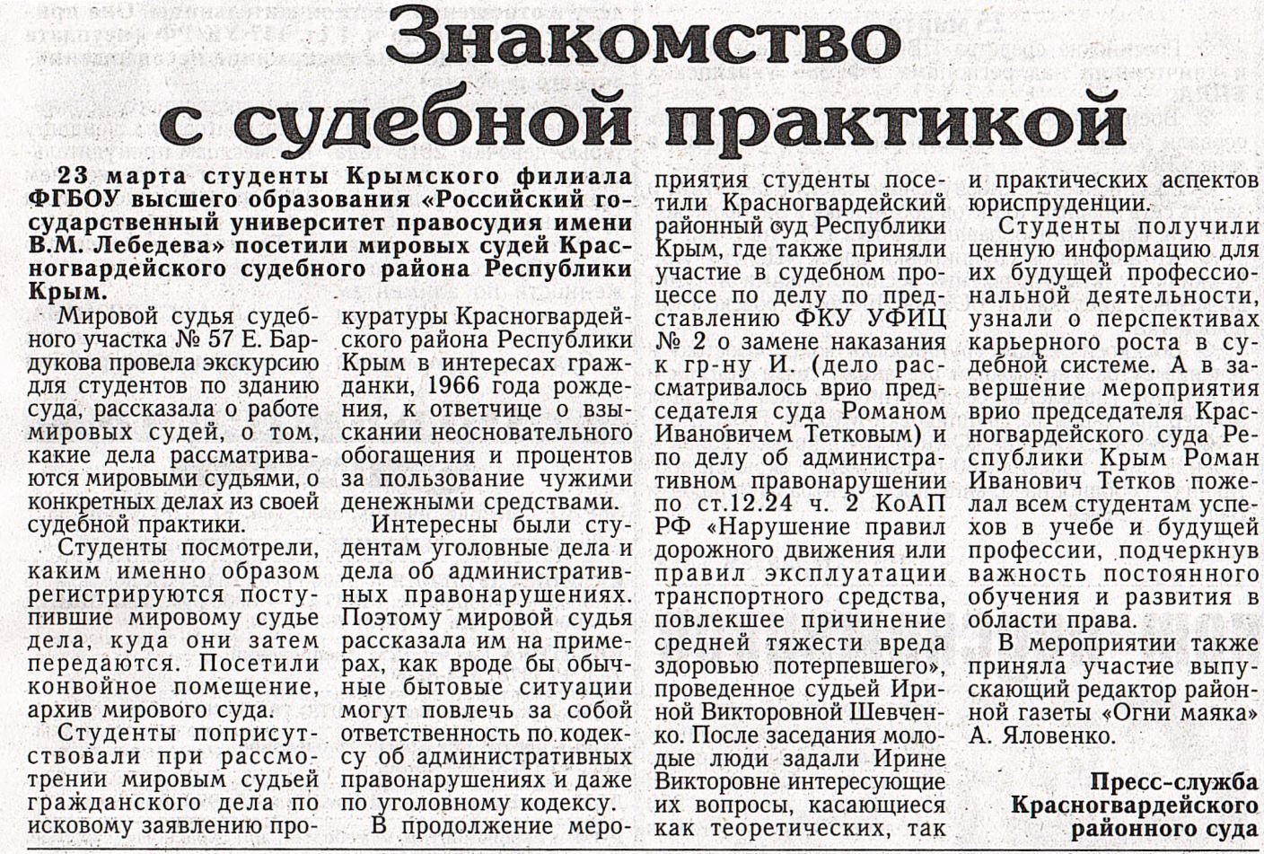 "Огни маяка" Знакомство с судебной практикой
